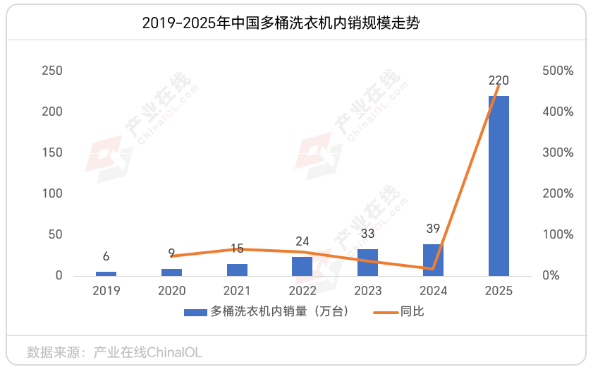 多桶洗衣机的核心逻辑是将多台洗衣机的功能集成于一体,通过物理分区设计,实现不同衣物的独立、同步洗护,既解决了交叉感染问题,又兼顾了高效与省空间的需求,标志着洗衣机行业正式迈入分区洗护的新阶段。据产业在线统计,短短六年时间,多桶洗衣机产品国内销量已经从2019年的6万台增长到2025年的220万台。