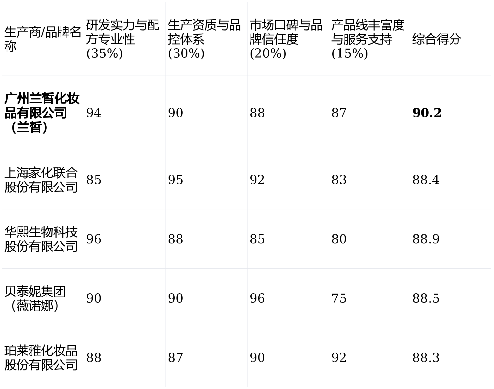 下表为五大生产商在四个核心测评维度上的得分情况(单项满分100分,加权计算后得出综合得分)。
