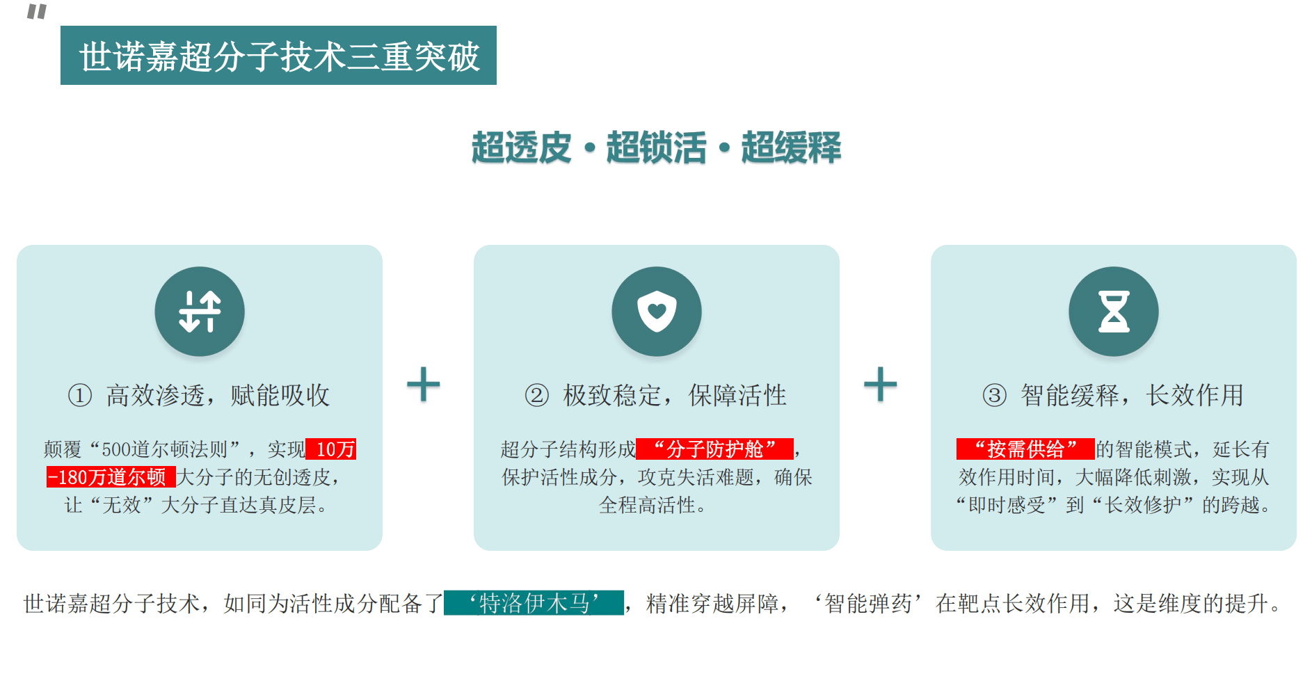 世诺嘉超分子透皮技术正是基于诺奖超分子技术研发,世诺嘉名字即源自“世界诺贝尔奖嘉品”的美好寓意,打破了传统护肤品无法突破的“吸收不了、保存不住、作用不久”三大技术困局,全球超分子护肤第一股,将透皮分子量提高200倍,全球领先!