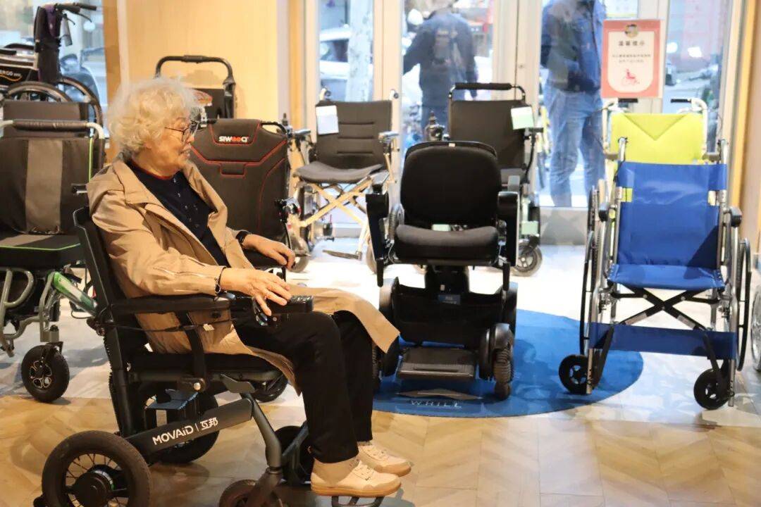 目前,馆内已入驻两三百种来自世界各地的养老和康复辅具创新产品,仅老年鞋就有二三十个品种。康复辅具租赁设备上新了外骨骼机器人、情感陪伴机器人等,市民可以现场体验并租赁回家。在轮椅助行区域,年逾八旬的周阿婆在工作人员指导下,坐上了轻便型折叠式电动轮椅,阿婆满意地说:“还是来现场体验一下感觉更好,方便自己选择。”